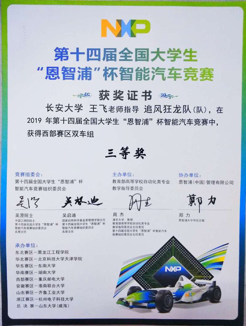 全国大学生智能汽车竞赛由教育部高等学校自动化专业教学指导分委员会主办。该竞赛是以智能汽车为研究对象的创意性科技竞赛,是面向全国大学生的一种具有探索性工程实践活动,是教育部倡导的大学生科技竞赛之一。该竞赛以“立足培养,重在参与,鼓励探索,追求卓越”为指导思想,旨在促进高等学校素质教育,培养大学生的综合知识运用能力、基本工程实践能力和创新意识,激发大学生从事科学研究与探索的兴趣和潜能,倡导理论联系实际、求真务实的学风和团队协作的人文精神,为优秀人才的脱颖而出创造条件。该竞赛是以迅猛发展的汽车电子为背景,涵盖了控制、传感技术、电子、电气、计算机和机械等多个学科交叉的科技创意性比赛,是面向全国大学生的一种具有探索性工程实践活动。该竞赛是在统一汽车模型平台上,使用恩智浦半导体公司的8位、16位、32位微控制器作为核心控制模块,通过增加道路传感器、设计电机驱动电路、编写相应软件以及装配模型车,制作一个能够自主识别道路的模型汽车,按照规定路线行进,以完成时间最短者为优胜。