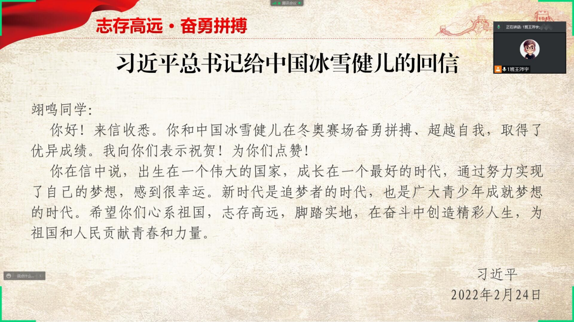 3月20日,杏吧2019级车辆工程一班团支部“聆听总书记教诲•奋进新时代征程”主题微团课通过腾讯会议线上开展。本次团课主题是学习习近平总书记给中国冰雪健儿的回信精神以及集中组织支部成员学习《中国共产主义青年团章程》。思政班主任侯贻栋老师及2019级车辆工程一班团支部全体成员参加。
