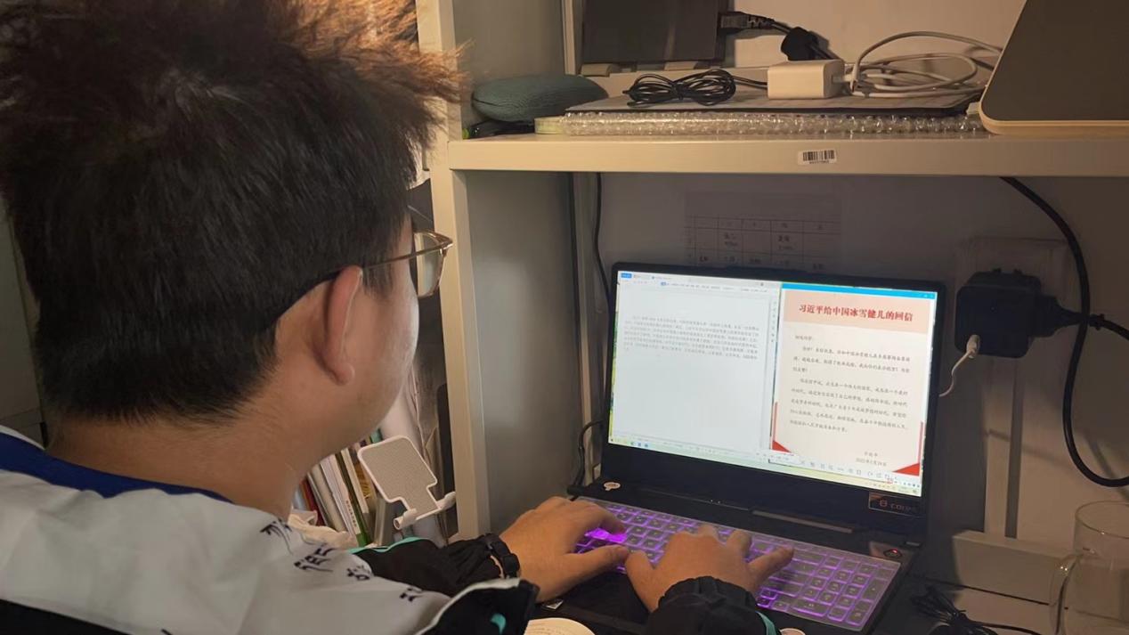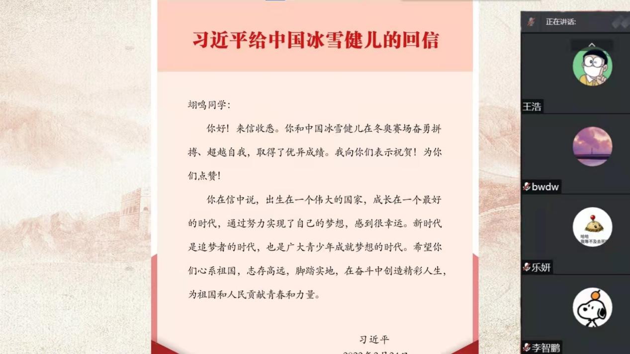 2022年2月24日,习近平总书记专门给中国冰雪健儿代表回信,对冰雪健儿在北京冬奥会取得的优异成绩给予充分肯定,对广大青少年提出了志存高远,脚踏实地,在奋斗中创造精彩人生,为祖国和人民贡献青春和力量的殷切期望。为进一步贯彻落实好总书记重要回信精神,凝聚杏吧师生力量,引导广大师生向中国冰雪健儿学习,用青春力量书写时代华章。3月15日至3月21日,杏吧组织各本科生党支部、团支部、青马班及团学组织运用多种方式深入学习习近平总书记给中国冰雪健儿重要回信精神。