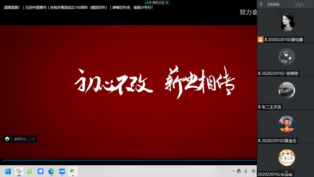 为庆祝建团100周年,激发班级同学传承奋斗精神,勇担青春使命的责任感,2020级车辆工程二班团支部于4月27日,线上开展了“百年团史·历史弥坚”主题团日活动,认真学习党领导中国青年运动的光辉历程,继承和弘扬革命先烈的崇高精神。本次团日活动由2020级车辆工程二班团支部全体成员参加。