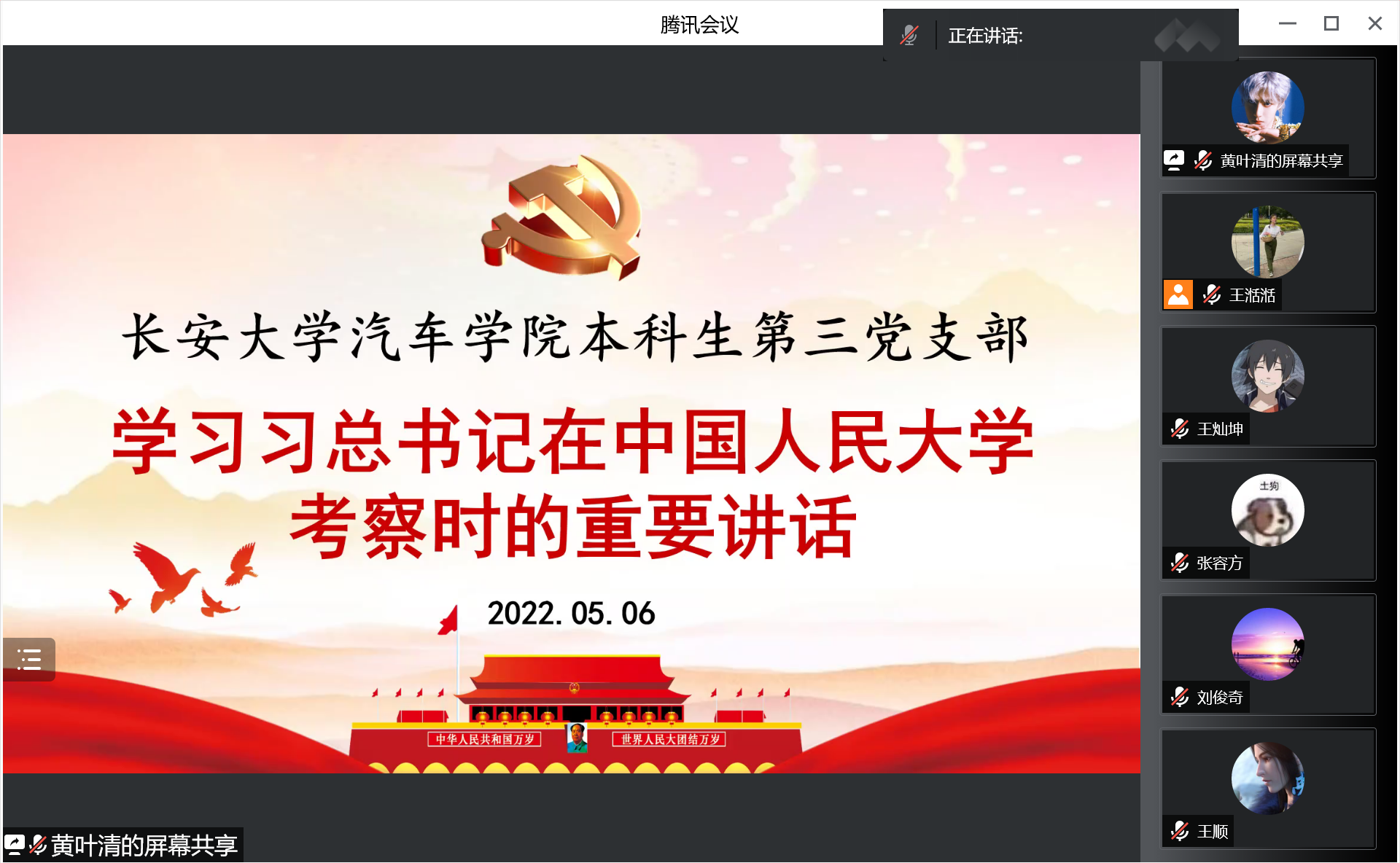 5月6日,杏吧本科生第三党支部在腾讯会议进行了关于学习习近平总书记在中国人民大学考察时的重要讲话的专题学习。会上组织委员黄叶清同学带领支部全体党员认真学习了习近平总书记的重要讲话。习近平总书记强调,广大青年要做社会主义核心价值观的坚定信仰者、积极传播者、模范践行者,向英雄学习、向前辈学习、向榜样学习,争做堪当民族复兴重任的时代新人,在实现中华民族伟大复兴的时代洪流中踔厉奋发、勇毅前进。同时习近平总书记指出,立足新时代新征程,中国青年的奋斗目标和前行方向归结到一点,就是坚定不移听党话、跟党走,努力成长为堪当民族复兴重任的时代新人。希望广大青年用脚步丈量祖国大地,用眼睛发现中国精神,用耳朵倾听人民呼声,用内心感应时代脉搏,把对祖国血浓于水、与人民同呼吸共命运的情感贯穿学业全过程、融汇在事业追求中。最后党支部书记许老师总结发言,作为新时代的大学生,我们一定要肩负起当代青年大学生的责任使命,勇当开路先锋、争当事业闯将,为中华民族伟大复兴不懈奋斗。
