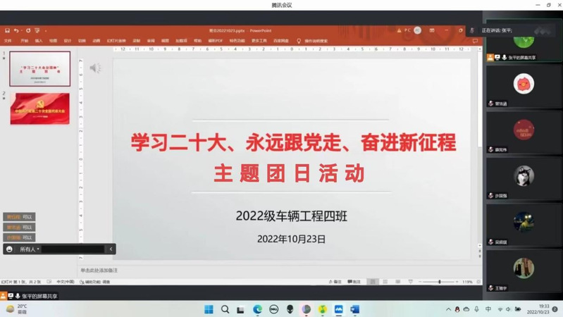 为深入学习党的二十大报告内容,激励广大青年学子学习红色新思想,坚定不移跟党走。10月23日,杏吧2022级车辆工程四班团支部开展了以“学习党的二十大,永远跟党走,奋进新征程”为主题的线上团日活动。活动由班主任张平老师主持,团支部全体成员参加。
