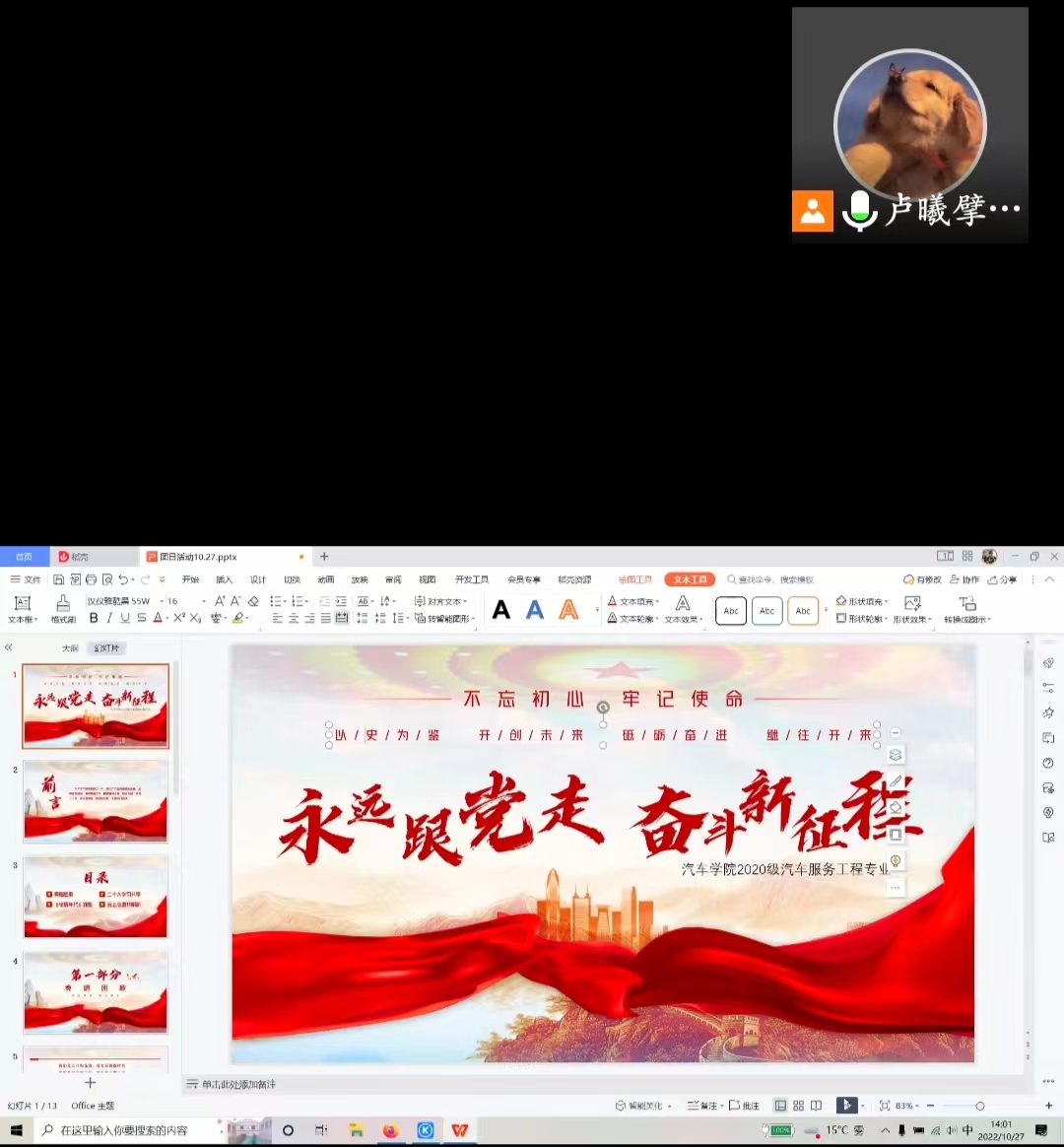 中国共产党第二十次全国代表大会于2022年10月16日在北京召开。为了引领青年政治思想,紧跟国家大事发展,深入学习党的二十大精神,10月27日,杏吧2020级汽车服务工程专业举行“永远跟党走,奋进新征程”主题团日活动。会议由2020级汽车服务工程三班团支书卢曦擘主持,2020级汽车服务工程全体学生参加。
