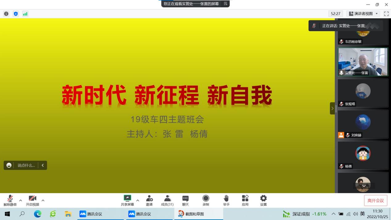 2019级车辆工程4班以线上会议的形式开展了“新时代·新征程·新自我”主题班会。活动由班主任张雷主持,辅导员杨倩及班级同学参加。