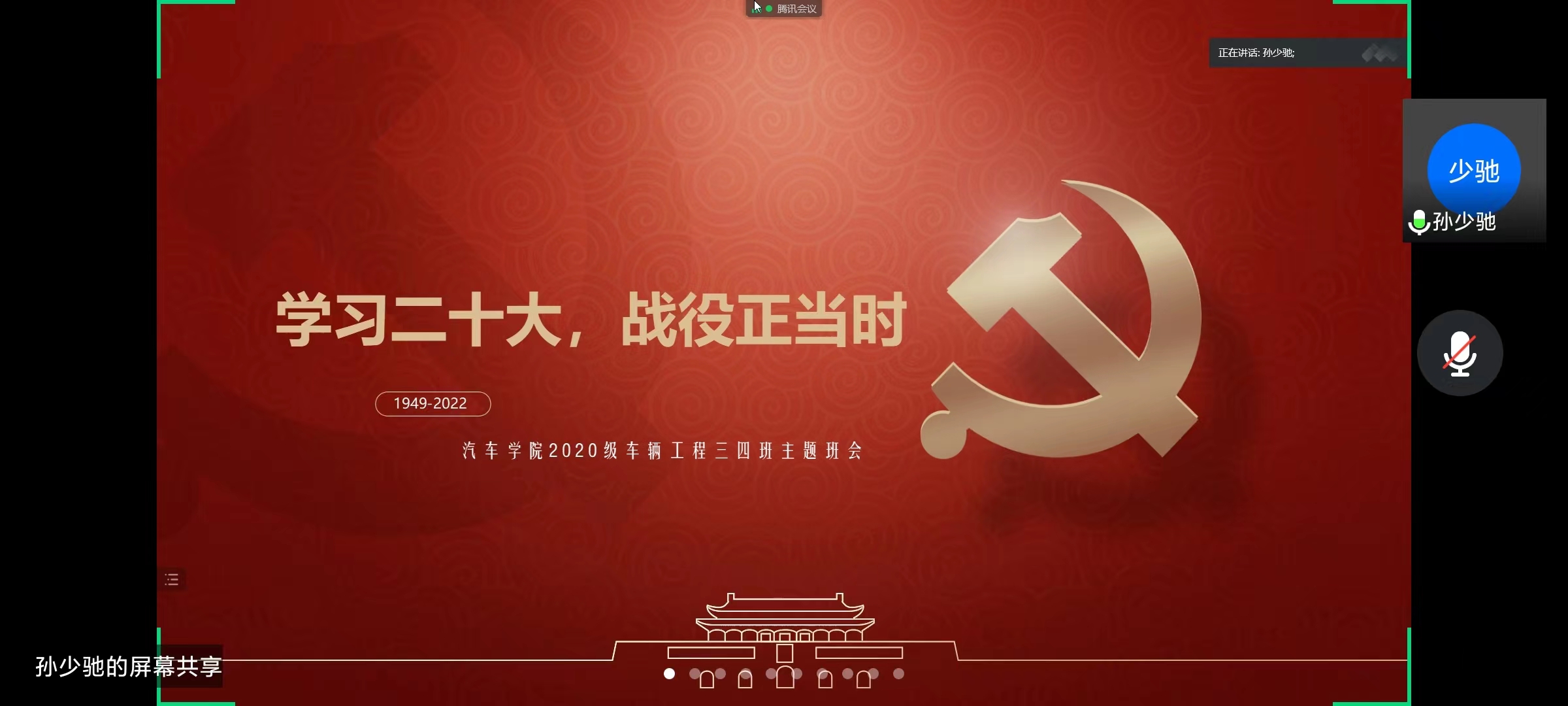 为深入学习党的二十大精神,贯彻落实学校防疫措施,10月27日,杏吧2020级车辆工程三四班联合举行“学习党的二十大,争做抗疫生力军”线上主题班会。班会由车辆工程三班班长孙少驰主持。