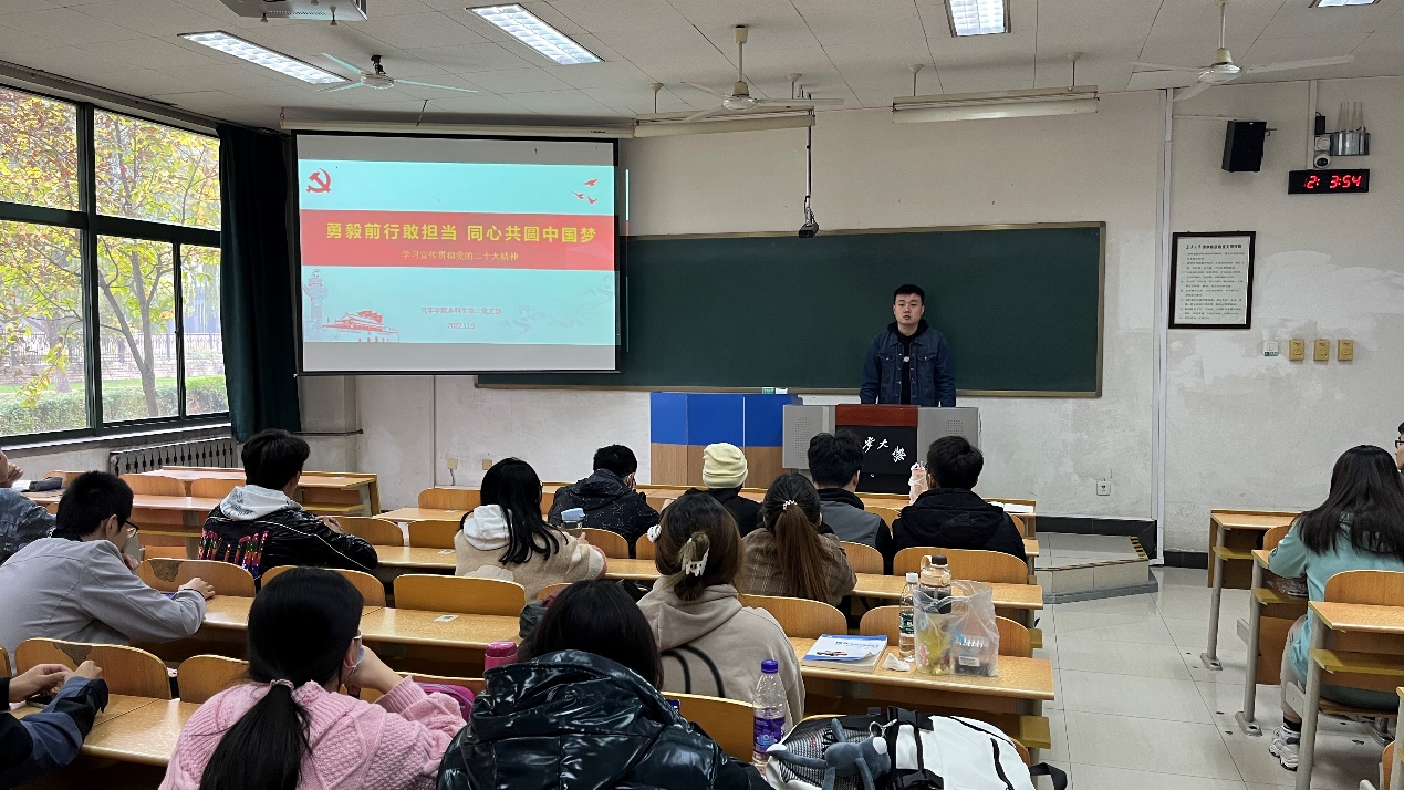 11月9日,杏吧 本科生第三党支部召开“学习宣传贯彻党的二十大精神”专题学习。会议由党支部书记许超然主持,支部全体党员参会。本次专题学习由党支部组织委员王帅领学,他带领同志们深入学习了包括党的中心任务、中国式现代化的中国特色和本质要求、全面建设社会主义现代化国家的首要任务以及跳出历史周期率的第二个答案等内容。他强调,身为新时代新青年,我们应当紧紧跟党走,提高政治站位,将自身命运同党和国家联系在一起,努力锤炼本领,增强创新意识,为实现中华民族伟大复兴贡献我们的青春力量。支部书记许超然作总结发言,他指出,学生党员要深入学习宣传贯彻党的二十大精神,要将党的二十大报告的要求同具体实际相结合、同学生责任相结合、同个人发展相结合,坚持把自己摆进去、把使命摆进去、把身份摆进去,要以“时不我待”的紧迫感和“舍我其谁”的责任感积极投身全面建设社会主义现代化国家的奋斗征程。