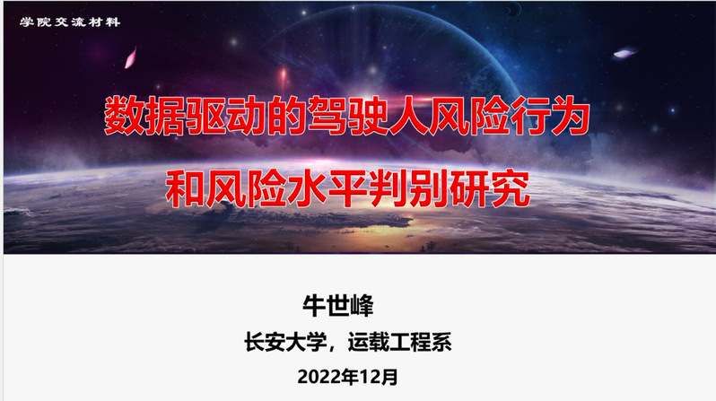 2022年12月15日,杏吧 举办的线上系列学术活动,学术报告十三“数据驱动的驾驶人风险行为和风险状态判别研究”顺利举行。本次报告由牛世峰教授分享关于数据驱动的驾驶人风险行为和风险状态判别方面的研究成果。
