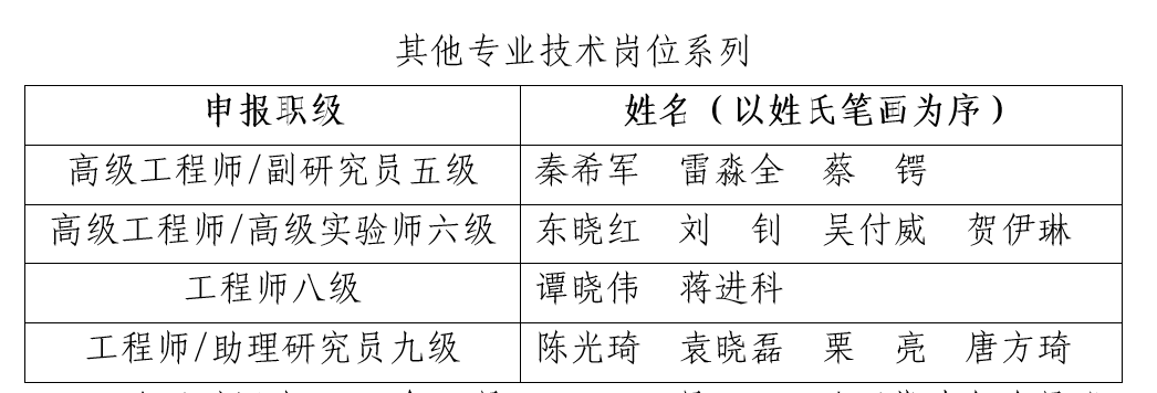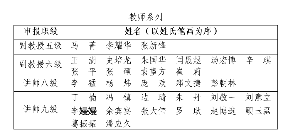 根据《杏吧 专业技术岗位晋级聘任实施细则》和《杏吧 五级及以下专业技术岗位晋级实施办法》,经个人申请和资格审查,现有3位同志符合五级副教授申报条件、10位同志符合六级副教授申报条件、5位同志符合八级讲师申报条件、14位同志符合九级讲师申报条件、3位同志符合高级工程师/高级实验师/副研究员五级申报条件、4位同志符合高级工程师/高级实验师申报条件、2位同志符合工程师八级申报条件、4位同志符合工程师/助理研究员九级申报条件。现将审查通过人员名单予以公示,申报材料在杏吧 307办公室进行展示: