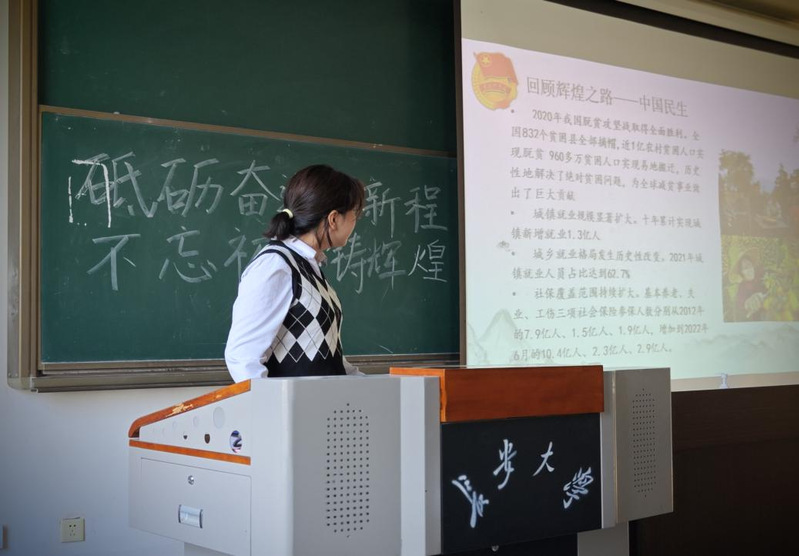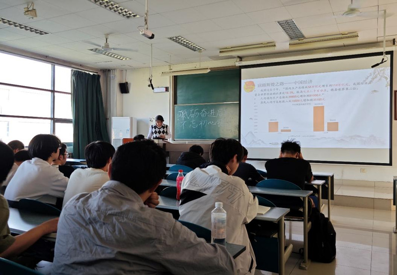 课上,党瑞洁带领同学们回顾了过去十年中国曾书写下的辉煌成就,紧接着又回顾我校师生在过去十年所取得的丰硕成果,启发同学们要学习辉煌成就的创造者,在新征程上勇于面对青年的时代使命和历史责任。