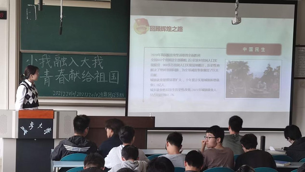 首先,由车辆工程一班团支书党瑞洁带领同学们回顾了过去十年来中国人民曾书写的辉煌成就以及其中长大人的贡献与付出,讲述无数长大人将小我融入大我的感人故事;接着车辆工程二班团支书白正楠为同学们讲述了身边的榜样力量——“长大之星”,鼓励同学们以这些耀眼的星星为前进的动力,不断提升自我,不断突破自我;最后,同学们共同学习了习近平总书记对青年的寄语。