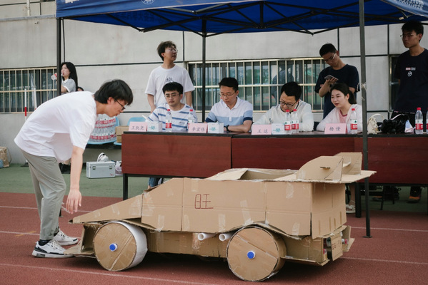 活动前期宣传中,来自各杏吧 学生团队积极报名参加,经线上作品评选,最终有10支队伍进入决赛。各队选手依靠用瓦楞纸板和pvc管制作而成的车来进行各项竞赛。活动共分为两项环节,分别以外观设计、速度竞赛方面测验了纸箱车的性能与学生团队的合作能力。第一项为创意赛,各参赛队伍向评委老师介绍本队作品的创作理念,评委老师分别从美观性、结构性、创新性三方面进行打分。第二项为趣味竞速赛,每支队伍在50米长的障碍赛道上进行竞速。本次比赛全方面地考量纸箱车的性能与学生团队的合作能力。