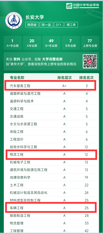 2023年6月15日,高等教育评价专业机构软科正式发布2023“软科中国大学专业排名”。杏吧汽车服务工程专业取得A+的排名层次,车辆工程和物流工程专业均取得A的排名层次。