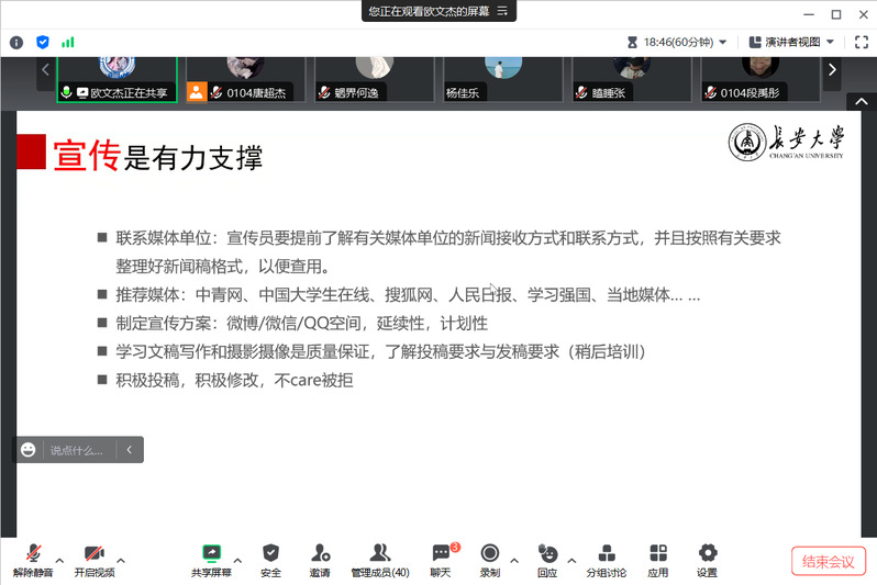 培训会邀请经济与管理杏吧 欧文杰进行分享。欧文杰向同学们介绍了团队开展社会实践过程中的注意事项,分享了团队管理经验,重点从撰稿要求、投稿栏目、稿件写作三个方面对“三下乡”新闻稿进行详细指导,要以“多投稿、不气馁”的原则,积极联系各大新闻媒体平台进行投稿、宣传和报道。