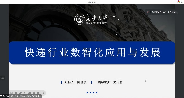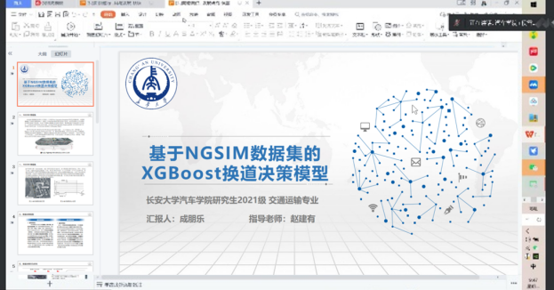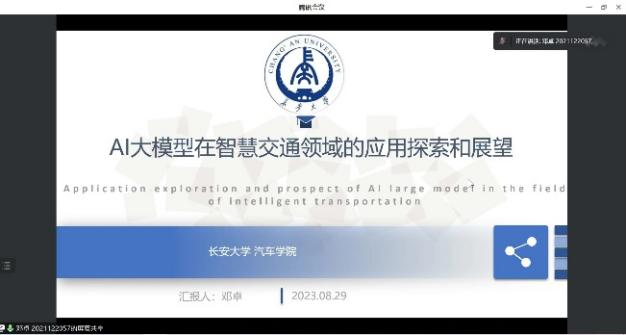 此后,硕士研究生侯雪作了《物流供应链数智化发展研究》的报告,从物流供应链管理技术的应用、物流供应链数智化发展路径以及物流供应链创新策略三个方面进行介绍,提出了自己关于物流供应链管理体系的见解;硕士研究生陶旭秋作了《快递行业数智化应用与发展》的报告,分析了快递行业数智化的行业发展及瓶颈,分享了数智化在快递行业中的应用,并提出未来多种先进技术成果将会助力快递行业的发展;硕士研究生邓卓作了《AI大模型在智慧交通领域的应用探索及展望》的报告,从AI大模型的概念出发,通过AI大模型在交通感知中的具体应用案例,指出大模型使AI行业迁跃到一个全新的阶段;硕士研究生成朋乐作了《考虑驾驶风格的XGBoost换道决策模型》的报告,讲解了NGSIM数据集的作用以及国内外换道决策模型的研究现状,并总结了NGSIM数据预处理与特征提取的方法与结果。