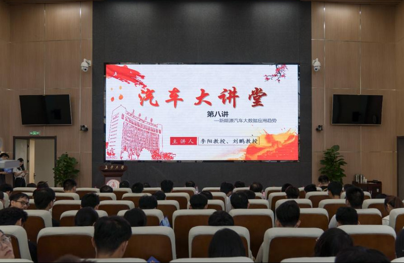 随后,刘鹏老师以《新能源汽车网联大数据技术体系建设与应用探索》为题,与现场师生进行学术分享。他指出,目前我国在新能源汽车产业规模、动力电池产业规模、充电基础设施数量、车联网及运行监管覆盖四方面全球领先。通过对新能源汽车大数据的研究挖掘,能够有效赋能新能源汽车的研发、营销及安全管理。