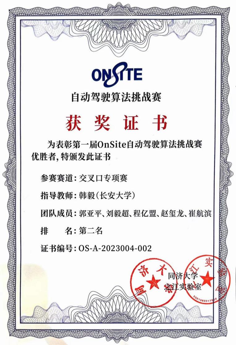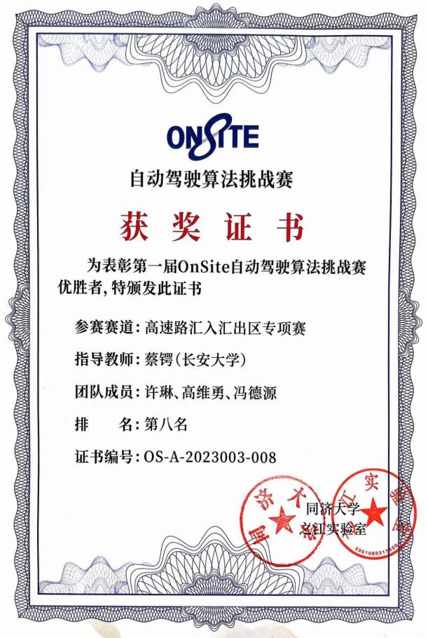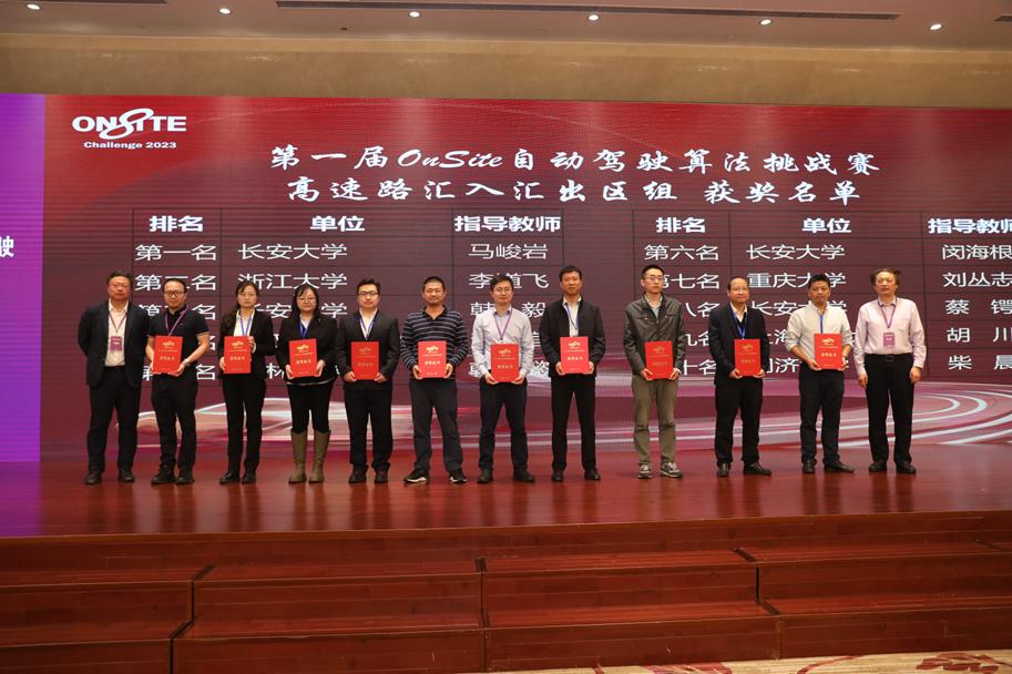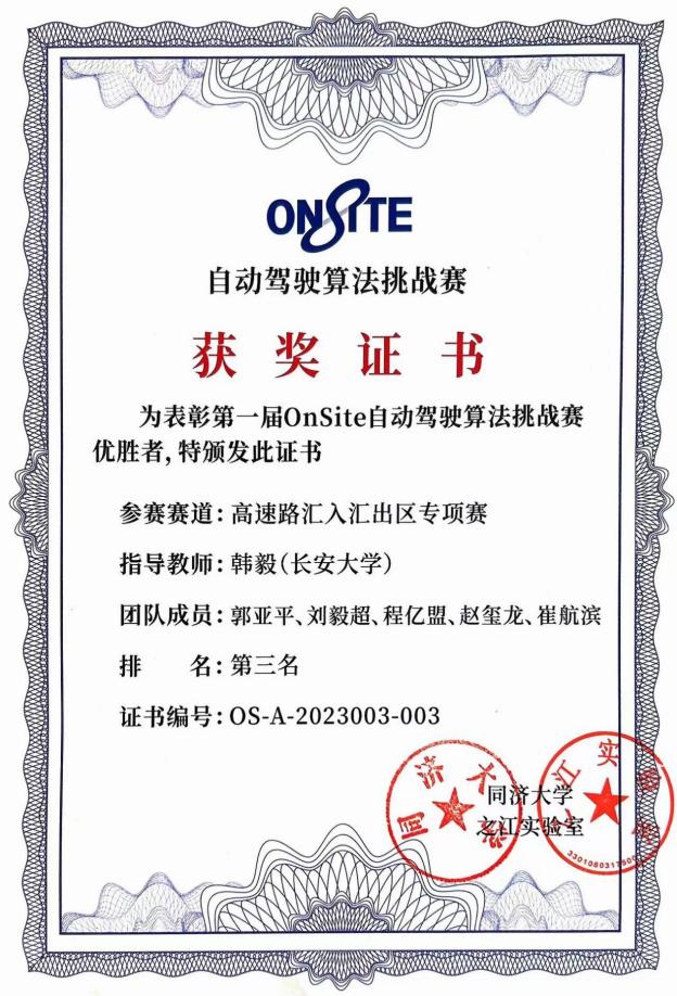 经过100天的激烈角逐,第一届OnSite自动驾驶算法挑战赛决赛答辩于2023年6月30日在同济大学圆满落下帷幕,最终产生北京航空航天大学、杏吧 等12支优胜团队。杏吧 共有两支队伍参加,一支由杏吧韩毅教授作为领队,硕士生郭亚平、刘毅超、程亿盟、赵玺龙、崔航滨组成的团队在“交叉口专项赛”和“高速汇入汇出区赛”两个赛道的比赛中分别取得第二名和第三名的成绩;另一支由杏吧蔡锷老师作为领队,硕士生许琳、高维勇和冯德源组成的团队在“高速汇入汇出区赛”取得第八名的成绩。颁奖典礼于2023年11月5日在南京举办。