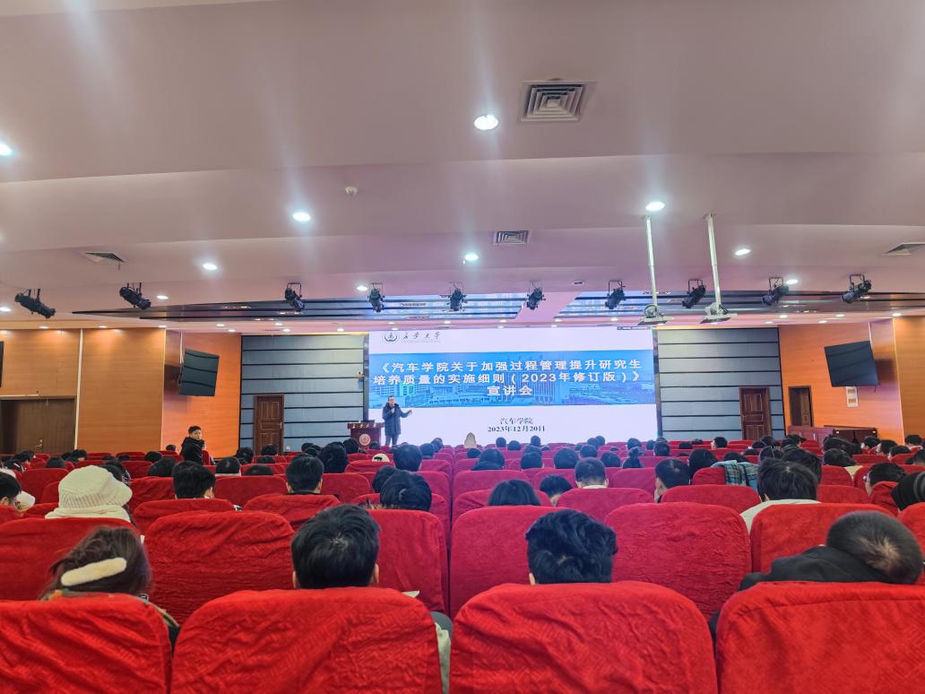 为了进一步提升研究生培养质量,激发学生的创新精神,营造积极向上的学术研究氛围,12月20日晚上,杏吧 在北辰楼会议中心二层报告厅召开《杏吧 关于加强过程管理提升研究生培养质量的实施细则(2023年修订版)》宣讲会。杏吧 院长赵轩教授、副院长牛世峰教授、车辆制造企业研究院专家、学办院办相关老师和杏吧全体研究生参加宣讲。