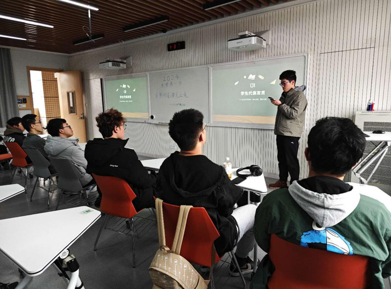 班会伊始,丁文皓同学就上一学期的学习生活向大家作以分享,他从学习的角度出发,讲述了自己如何将兴趣爱好与日常学习相结合,把自己对于车辆工程专业的热情投入到具体实践中去。