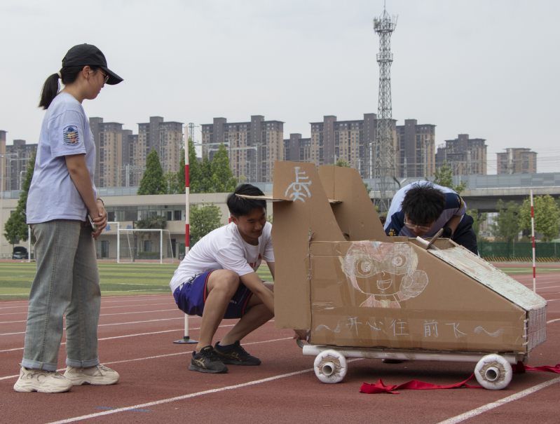 第二个环节为趣味竞速赛,在这个环节中,每支队伍需要在长达五十米的跑道上进行竞速比赛,在考量纸箱车性能的同时也考验了学生团队的合作能力。
