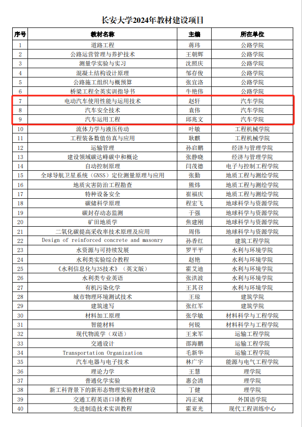 为助推我校“双一流”和“双万计划”建设,全面提升本科教材质量,充分发挥教材在人才培养中的基础性作用,学校组织开展了2024年教材建设项目立项工作,经主编申报、杏吧 (系)遴选推荐、杏吧 党委审核、教务处初审、专家评审、校内公示无异议,学校决定立项建设《道路工程》等40部本科教材。杏吧赵轩教授主编的《电动汽车使用性能与运用技术》、邱兆文教授主编的《汽车运用工程》、袁伟教授主编的《汽车安全技术》三本教材入选学校2024年教材建设项目立项名单。