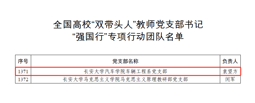 近日,教育部办公厅公布了全国高校“双带头人”教师党支部书记“强国行”专项行动团队名单。杏吧车辆工程系党支部成功入选。教育部此次开展的“强国行”专项行动,旨在创新落实立德树人根本任务,深入贯彻落实教育部党组关于高校“双带头人”教师党支部书记培育工作的部署要求,全面增强高校教师党支部的政治功能和组织功能,充分发挥基层党组织战斗堡垒作用和党员先锋模范作用,不断强化高校“双带头人”队伍建设和作用发挥。