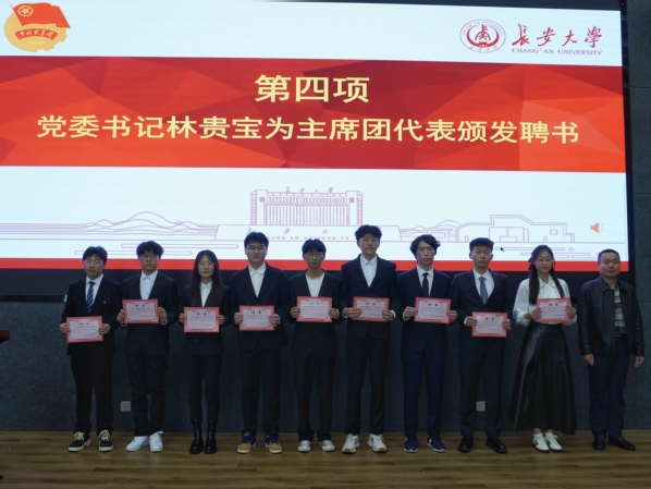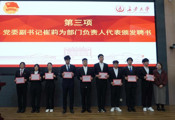 学生工作办公室主任郑文捷宣读《新一届学生组织及社团聘任文件》。林贵宝为主席团代表颁发聘书,崔莉为部门负责人代表颁发聘书。