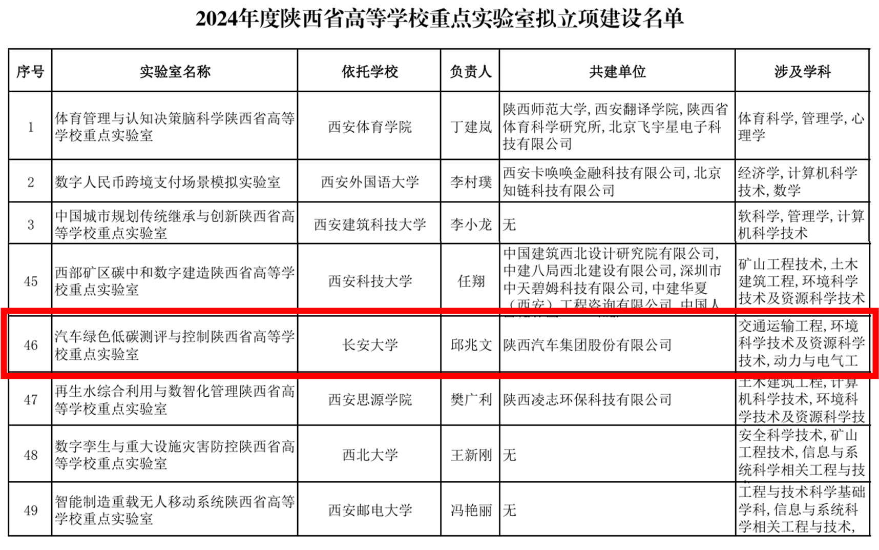 近日,陕西省教育厅公布了2024年度全省高等学校重点实验室立项建设名单,杏吧邱兆文教授牵头申报的“汽车绿色低碳测评与控制陕西省高等学校重点实验室”成功获批立项建设。