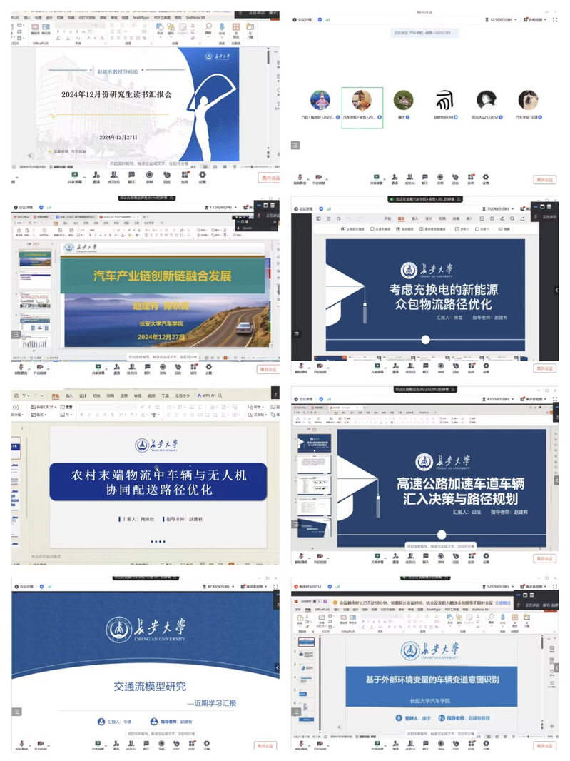 然后,硕士研究生侯雪作了《考虑充换电的新能源众包物流路径优化》的分享,包括研究意义、国内外研究现状、模型构建等方面,实现降低运营成本,优化运输和分配路径,减少物流成本和能耗的目的;陶旭秋汇报了有关《农村末端物流中车辆与无人机协同配送路径优化》的内容,从农村配送场景、车辆与无人机协同配送优势角度,分享了有关车辆与无人机协同配送的有关问题,引入车辆与无人机协同配送路径优化模型;田浩作了有关《高速公路加速车道车辆汇入决策与路径规划》的汇报,主要分享了车辆通过智能化决策与规划与周围环境进行互动,通过优化匝道汇入的行为决策与路径规划,有效减少车辆在汇入过程中的等待时间,并降低因车辆间不合理行为引发的交通事故;令潇分享了关于《智能网联环境下交通流模型研究》的主要内容,主要聚焦于研究智能网联环境下的混合交通流特性,以三车道平直公路为建模对象,结合人工驾驶车辆与智能网联车辆不同的行驶特性,考虑不同跟驰模式以及车辆类型对跟驰、换道行为的影响,建立混合交通流模型;康宇主要针对《考虑驾驶风格的车辆换道行为决策研究》有关内容展开,先探索不同交通环境中驾驶行为的波动特点,并据此建立动态驾驶风格表征方法将其纳入智能车辆换道决策模型中,收益方面加入驾驶人舒适度收益,利用博弈论对其交互过程分析,以更好的指导智能驾驶车辆决策。赵建有教授针对各研究生学习状况提出针对意见,主要集中在论文中创新点、数据整理、算法优化等问题。