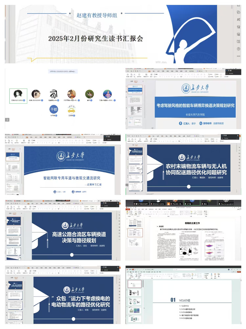 此后,硕士研究生令潇就学位论文《智能网联专用车道与微观交通流研究》作了汇报,主要从论文撰写思路以及模型建立展开,通过建立三种车辆跟驰模式下的跟驰模型、智能网联环境下换道模型,通过matlab对微观交通流进行仿真,对交通流基本图,拥堵率等结果进行分析。田浩作了有关《高速公路合流区车辆换道决策与路径规划》的汇报,探讨并优化匝道汇入过程中的车辆行为决策和路径规划问题,在动态交通环境下实现安全、高效的匝道汇入。康宇主要针对《考虑驾驶风格的智能车辆博弈换道决策规划研究》有关内容展开,在分析驾驶人的驾驶风格的基础上,以综合提高高速公路行驶的安全性、舒适性和通行效率为目标,进行了驾驶人风格识别、车辆换道博弈分析及车辆轨迹规划。侯雪作了《“众包”运力下考虑换电的电动物流车的路径优化研究》的分享,包括研究意义、国内外研究现状、模型构建等方面,实现降低运营成本,优化运输和分配路径,减少物流成本和能耗的目的。陶旭秋汇报了有关《农村末端物流中车辆与无人机协同配送路径优化》的内容,从农村配送场景、车辆与无人机协同配送优势角度,分享了有关车辆与无人机协同配送的有关问题,引入车辆与无人机协同配送路径优化模型。赵建有教授针对各研究生学习状况提出针对意见,主要集中在论文中创新点、数据整理、算法优化等问题。