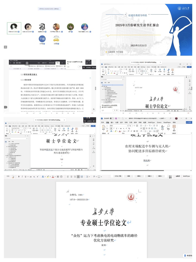 首先,硕士研究生田浩就《高速公路合流区智能车辆换道决策与路径规划研究》展开分享,主要讲述了有关车辆通过智能化决策与规划与周围环境进行互动,通过优化匝道汇入的行为决策与路径规划等方面的内容;康宇主要针对《考虑驾驶风格的智能车辆博弈换道决策规划研究》相关内容展开,通过不同交通环境中驾驶行为的波动特点,建立动态驾驶风格表征方法,并将其纳入智能车辆换道决策模型中,更好的指导智能驾驶车辆决策;令潇作了有关《智能网联环境下混合交通流模型与智能网联专用车道设置研究》的分享,结合人工驾驶车辆与智能网联车辆不同的行驶特性,考虑不同跟驰模式以及车辆类型对跟驰、换道行为的影响,建立混合交通流模型;陶旭秋分享了其有关《农村末端配送中车辆与无人机协同配送多目标路径研究》的内容,农村配送场景、车辆与无人机协同配送优势角度,构建车辆与无人机协同配送路径优化模型,并通过标准数据集进行算例分析;侯雪作了《“众包”运力下考虑换电的电动物流车的路径优化研究》的分享,包括研究意义、国内外研究现状、模型构建等方面的修改内容。赵建有教授针对各组员学位论文修改情况再次提出改进意见,注重摘要、结论撰写逻辑,强调写好、写全研究内容及创新点。