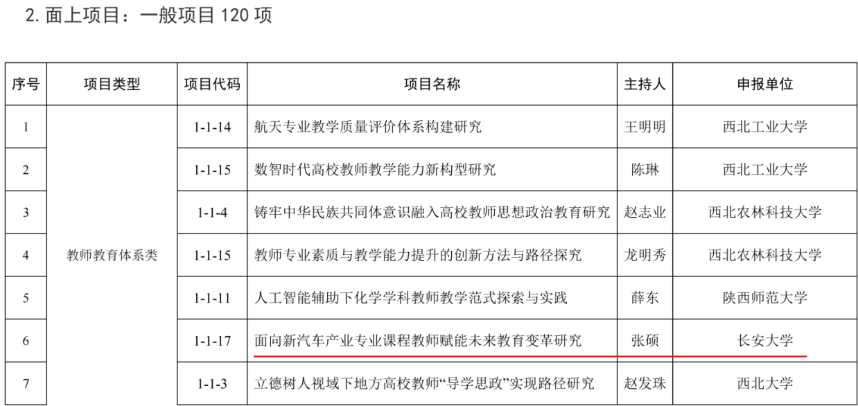 根据陕西省教师教育改革与教师发展研究项目管理办法的有关要求,陕西省教育厅组织开展了2025年度陕西省教师教育与教师发展研究项目申报和评审工作。经各单位申报、资格初审、申报公示、通讯评审和集中答辩等环节,确定拟立项教师项目369项,其中,面上项目150项(含重点项目30项,一般项目120项),人才专项项目219项。杏吧教师张硕申报的面上项目一般项目“面向新汽车产业,专业课程教师赋能未来教育变革研究”获批立项。