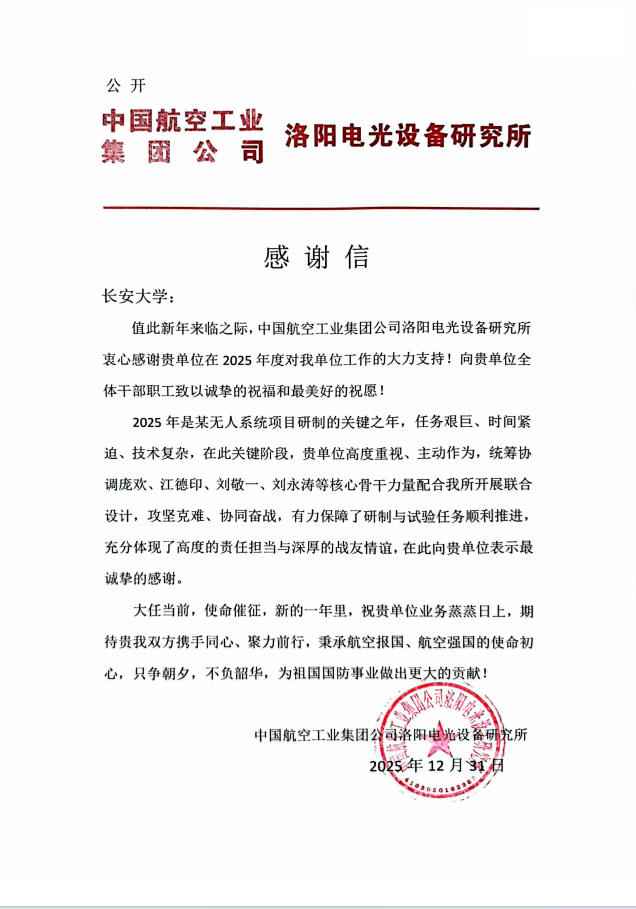 近日,中国航空工业集团公司洛阳电光设备研究所向我校发来感谢信,信中向学校及相关教师对研究所工作的支持表示诚挚感谢。